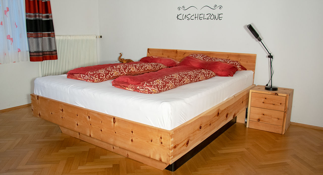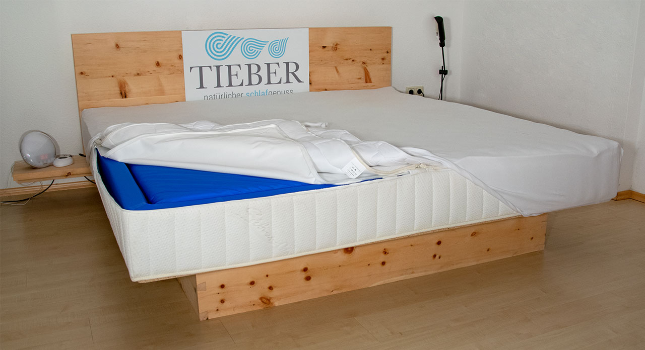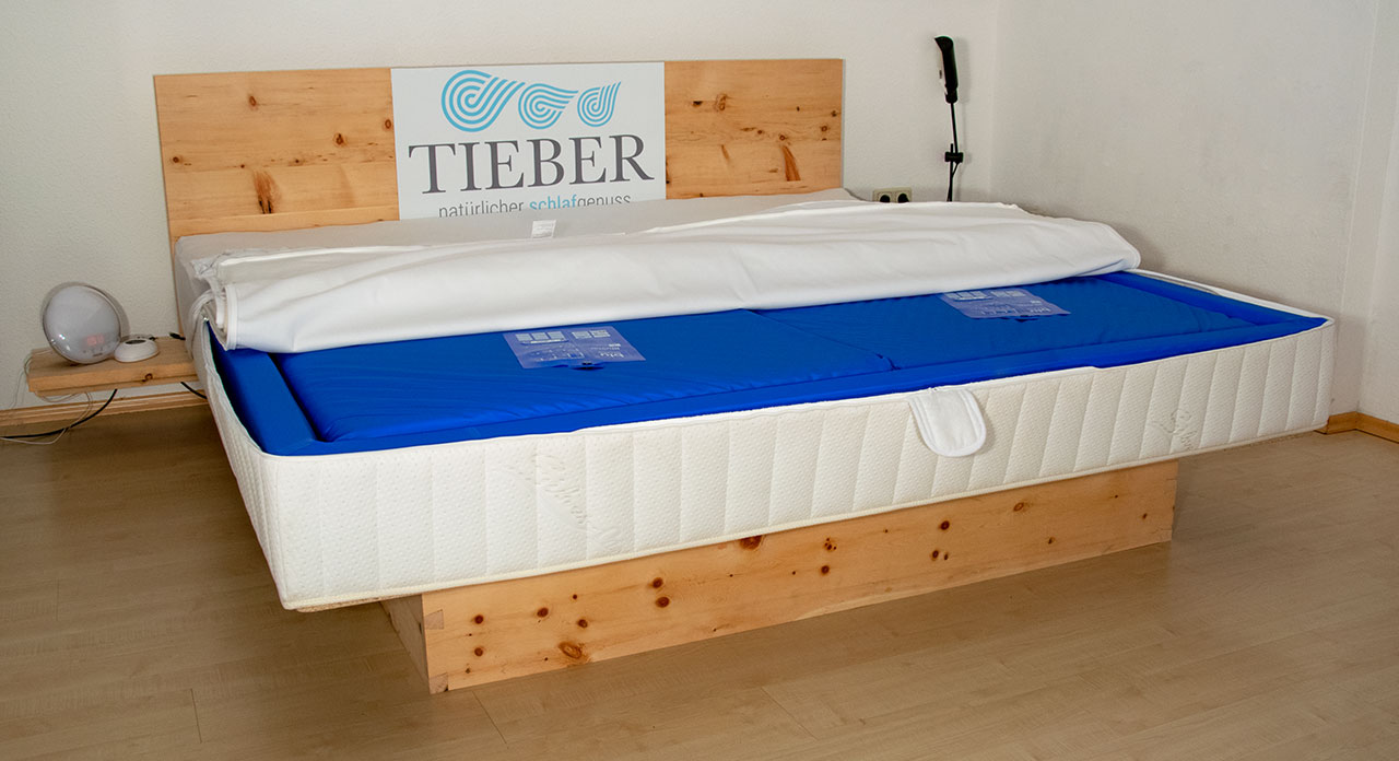 Ein Wasserbett in einen vorhanden Zirbenbettrahmen eingebaut